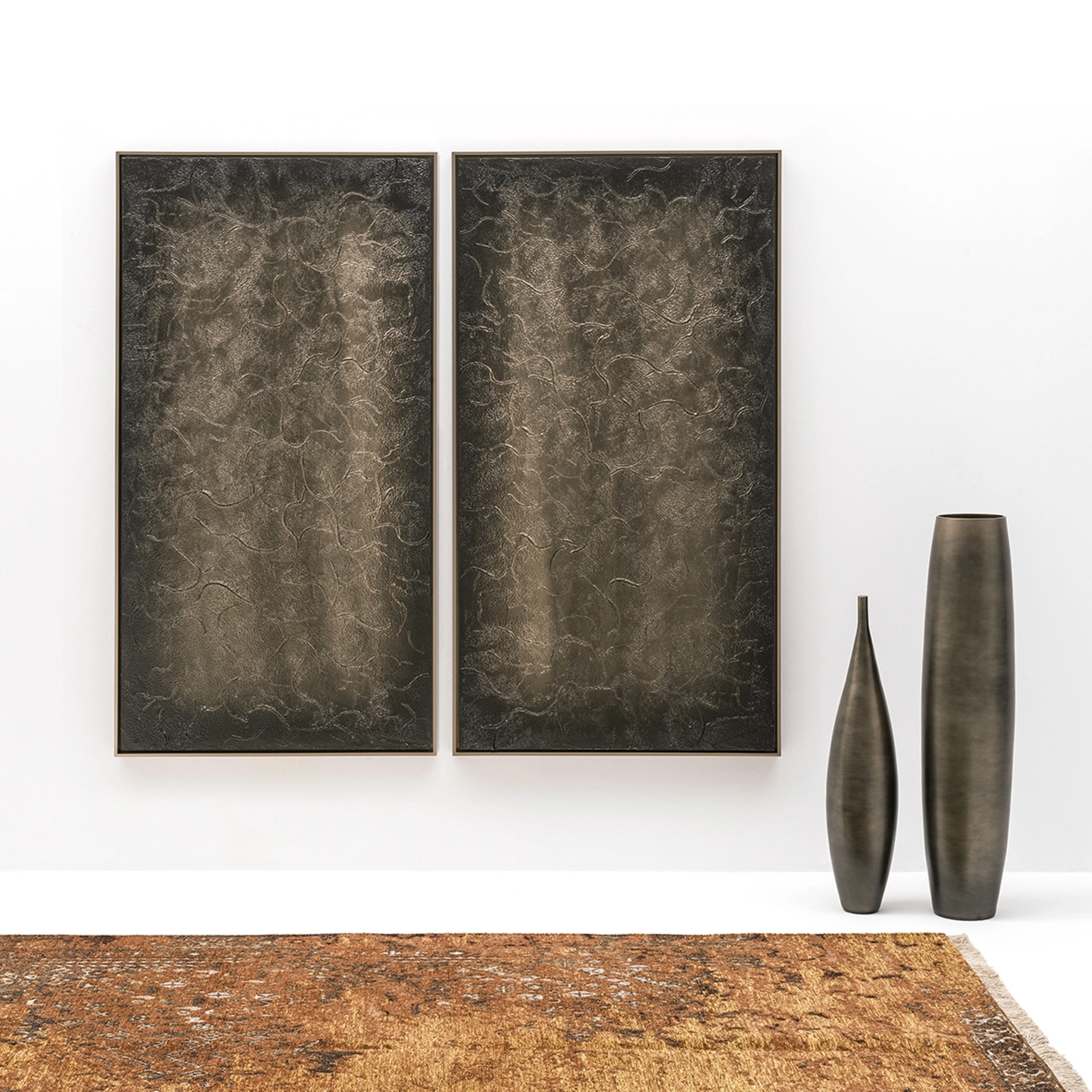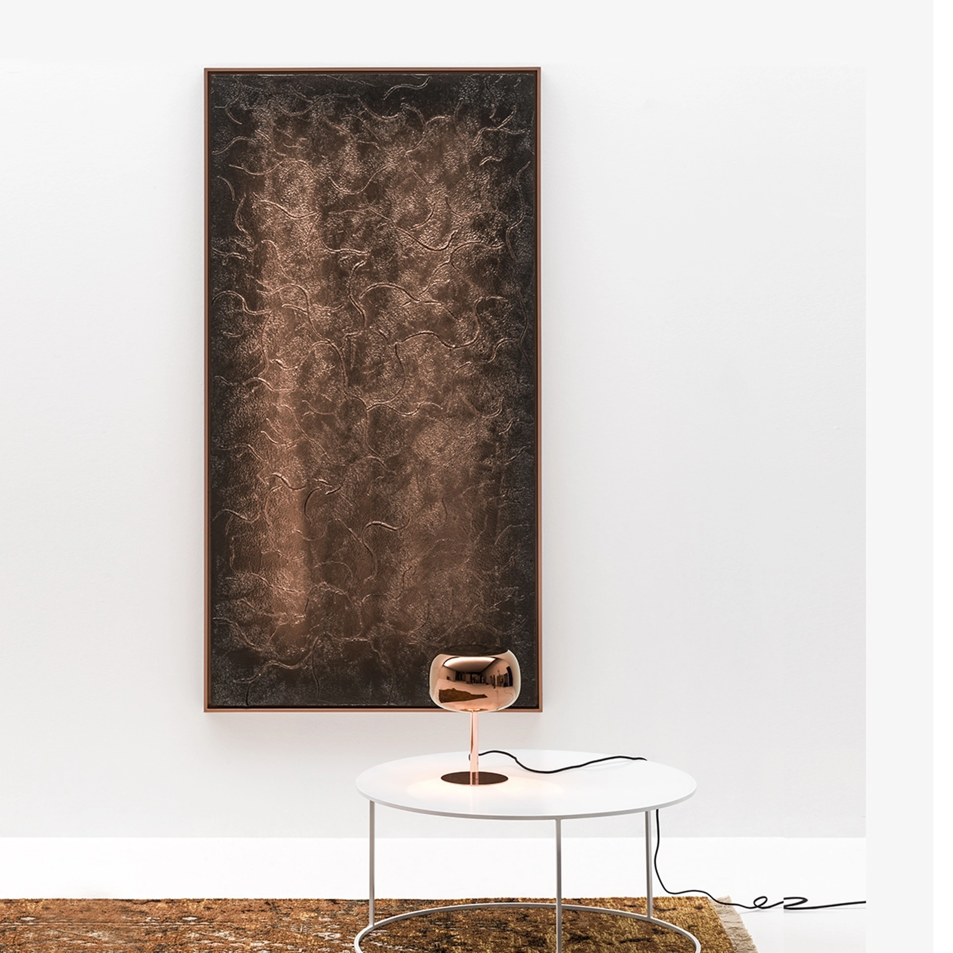 Questa scultura da parete, denominata Quadro Botticelli e firmata Adriani e Rossi, incarna un'espressione artistica tridimensionale. La sua realizzazione artigianale si distingue per l'impiego di finiture cementizie avanzate e verniciature metalliche, disponibili nelle sofisticate varianti Golden Black e Rosy Black. La superficie è caratterizzata da una meticolosa lavorazione a sbalzo, che richiama le tecniche di fusione tradizionali, conferendo profondità e carattere. L'opera è rifinita con una cornice modello Moma, proposta in nero o in una colorazione coordinata, esaltando la struttura e la composizione complessiva del manufatto. Questo manufatto è progettato per garantire longevità e mantenere inalterato il suo valore estetico nel tempo, rappresentando un investimento duraturo nel design d'interni.