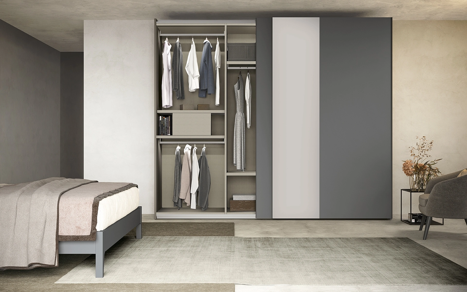 L'Armadio Freedom N17 di Colombini Casa si distingue come elemento centrale nella collezione di armadi moderni, concepito con ante scorrevoli per un'ottimale gestione dello spazio e un'estetica raffinata nella camera matrimoniale. La composizione 'Night&Day' è un esempio lampante di come soluzioni modulari e design contemporaneo possano convergere per potenziare la funzionalità della zona notte. Questo sistema d'arredo è l'esito di un'attenta ricerca che coniuga innovazione tecnica e praticità, offrendo un'esperienza d'uso superiore. L'armadio incarna la versatilità dei sistemi modulari avanzati, garantendo una personalizzazione profonda per ogni esigenza di spazio e stile.