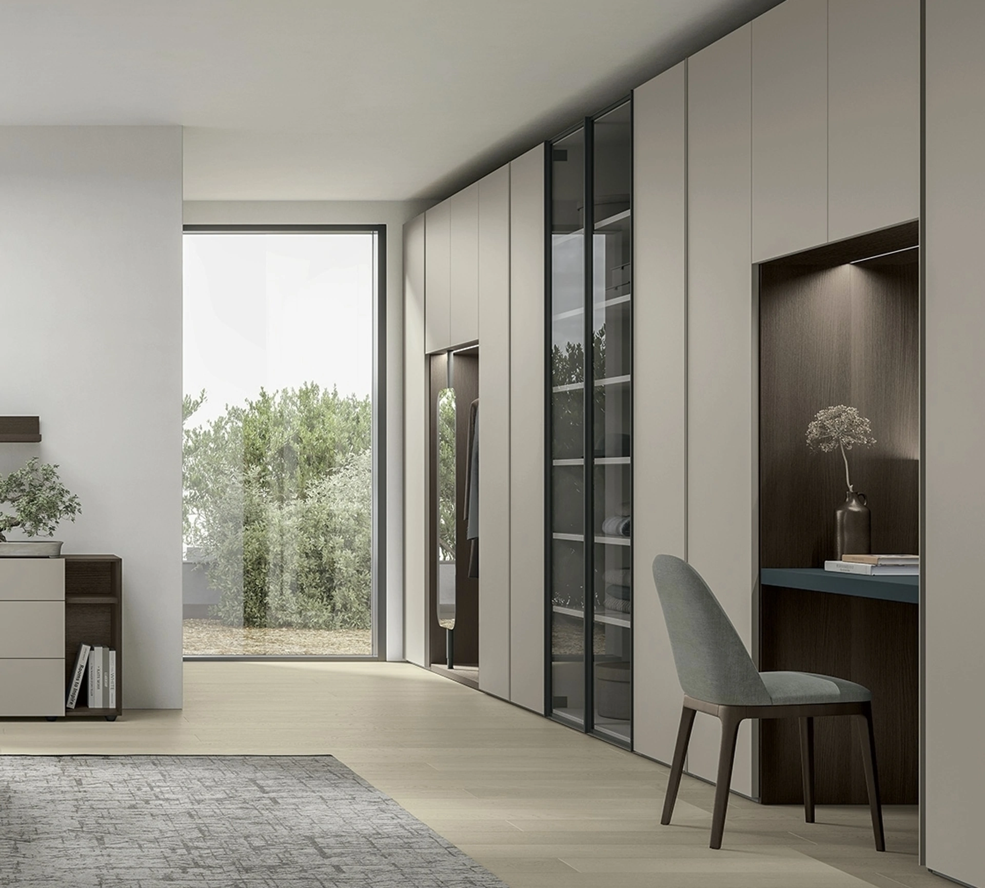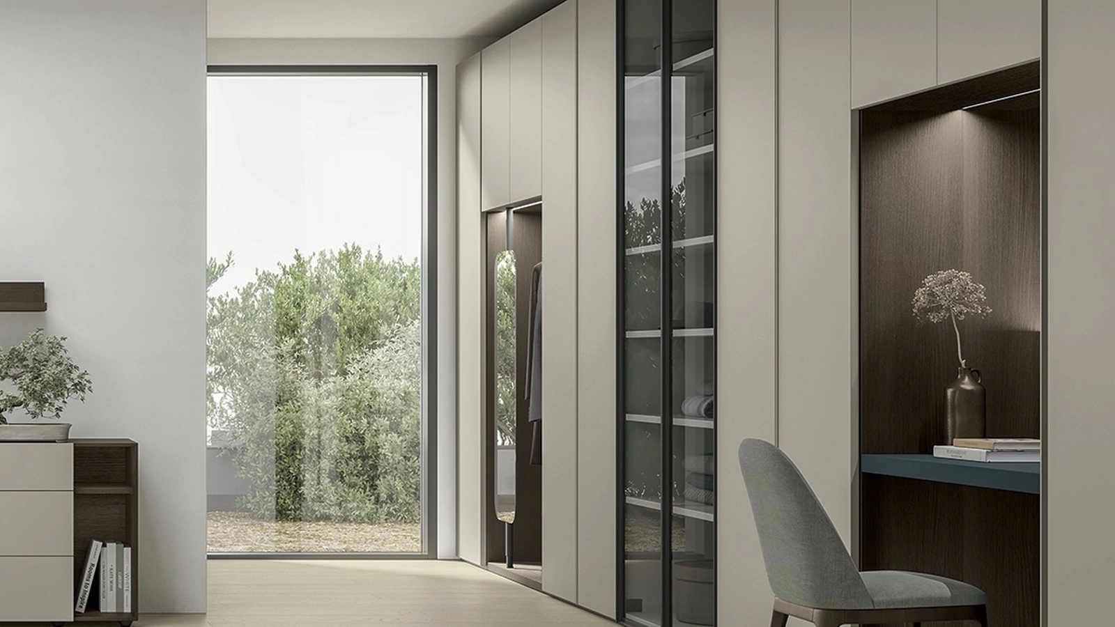 Il sistema Logica Plus UNIT 07 di Tomasella si presenta come un'armadiatura versatile, concepita per massimizzare l'utilizzo della parete principale della zona notte. Caratterizzata da moduli contenitori intelligenti, una zona appendiabiti integrata, una libreria con ante in vetro e una postazione beauty dedicata, Tutto è progettato per massimizzare la funzionalità dello spazio, configurando una soluzione d'arredo completa, di grande capacità e ordinata, ottimale per un ambiente che funge da camera e spogliatoio. Ogni componente è studiato per offrire performance ottimali e un'integrazione perfetta nell'ambiente, assicurando un'esperienza d'uso superiore e una lunga vita al prodotto.