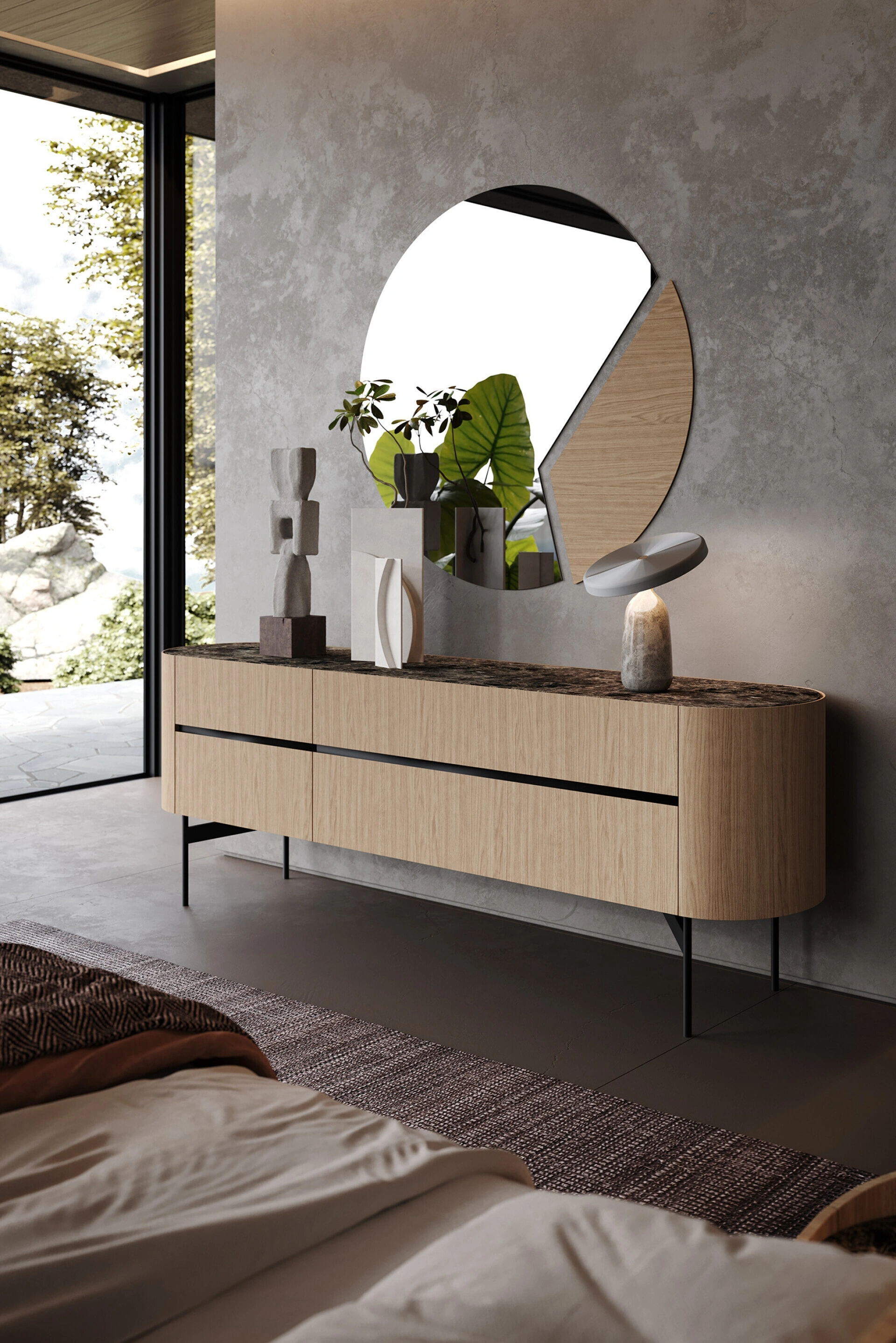 La base del comò è supportata da piedi in metallo verniciato o, per un effetto di leggerezza visiva, in vetro trasparente. Per un'esperienza d'uso ottimale, è disponibile un kit luci integrabile, gestibile tramite telecomando, che accentua le linee e le texture del mobile.