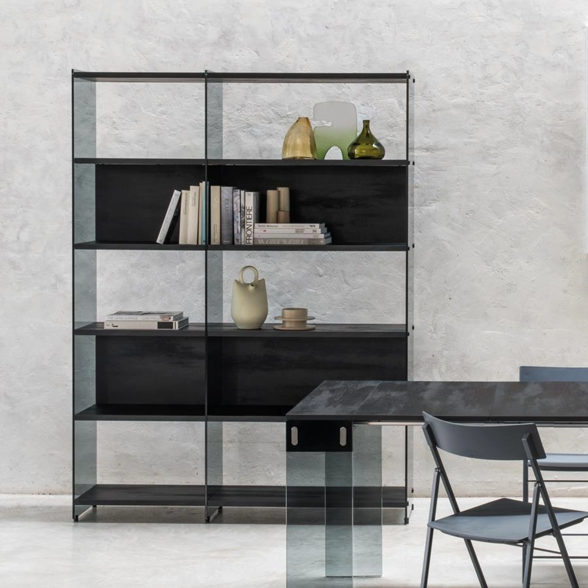La libreria modulare Byblos, firmata Pezzani, rappresenta una soluzione d'arredo dinamica e sofisticata, perfetta per configurazioni lineari o come elemento divisorio autonomo. La sua struttura si distingue per i robusti fianchi portanti in vetro temperato da 10 mm, offerti nelle varianti trasparente o fumé, che conferiscono leggerezza visiva e stabilità. I ripiani, realizzati in laminato da 25 mm, sono disponibili in un'ampia gamma di misure, da 43 cm fino a 128 cm, includendo anche moduli angolari da 53x53 cm e soluzioni integrate per TV fino a 50 pollici. Questa flessibilità compositiva permette di creare ambienti personalizzati e funzionali. L'accurata selezione dei materiali e le finiture di pregio garantiscono elevati standard qualitativi e un'estetica raffinata.