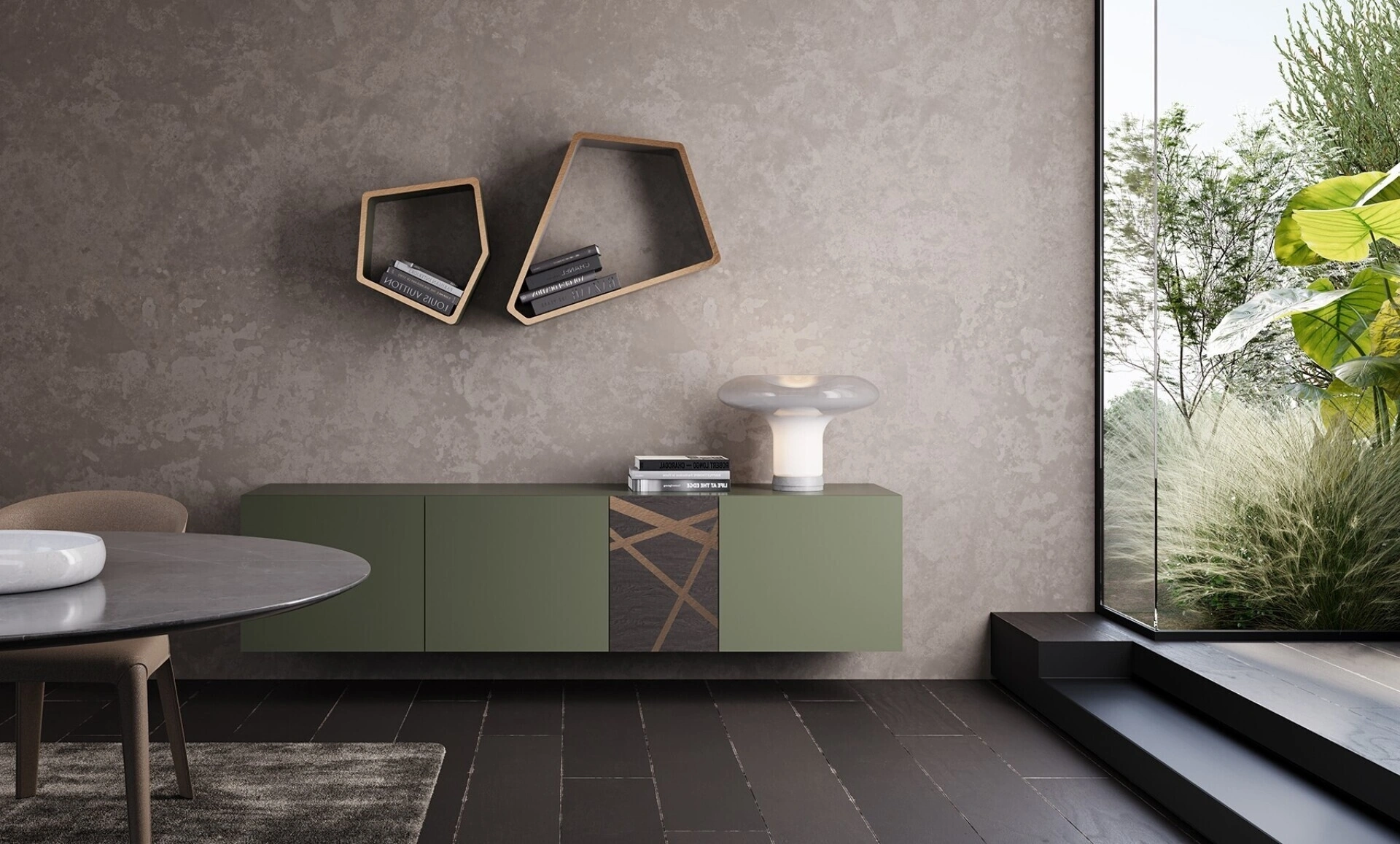 | Materiale: | Laccato opaco verde prussia, Quercia carbone, Bronzo graffiato, Vetro temperato |