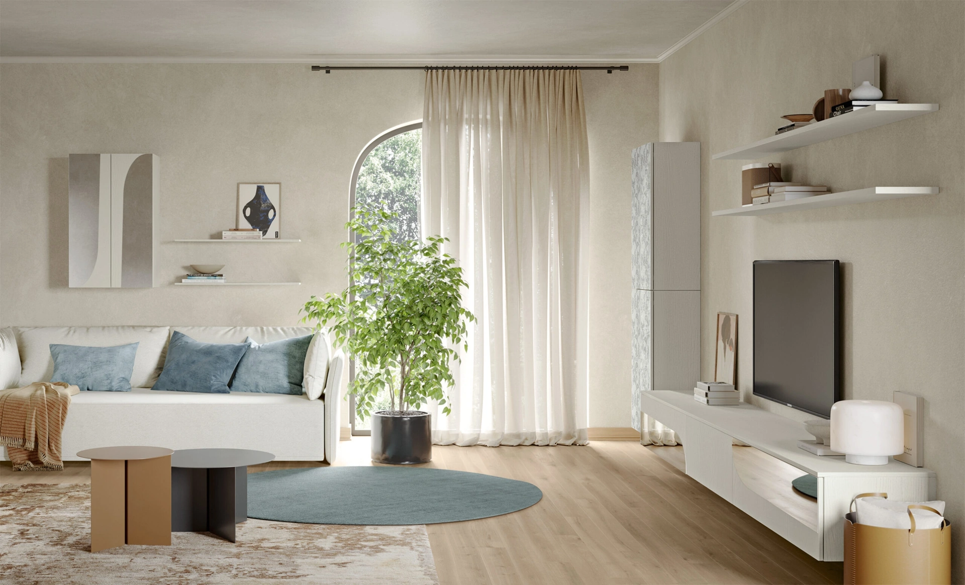 Quali sono le caratteristiche principali della parete attrezzata Eclettica EG004?Questa parete attrezzata Colombini Casa si distingue per la sua modularità, con basi, pensili e colonne configurabili. Include moduli TV, mensole e ante con diverse aperture, adatte a ogni esigenza di stile e funzionalità.