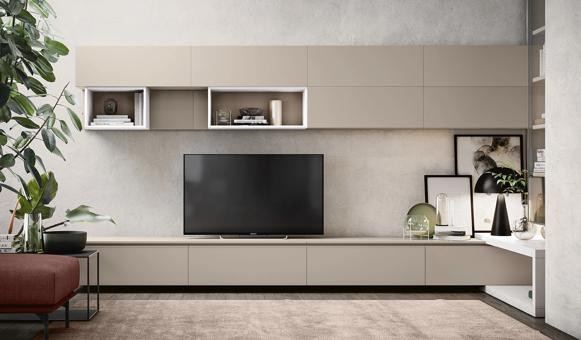 Quali sono le caratteristiche principali della parete attrezzata Golf Contract A02 di Colombini Casa?La parete attrezzata Golf Contract A02 offre modularità con basi, pensili e colonne. È possibile integrare moduli TV, mensole e ripiani a giorno, con diverse opzioni di ante per creare la composizione desiderata.