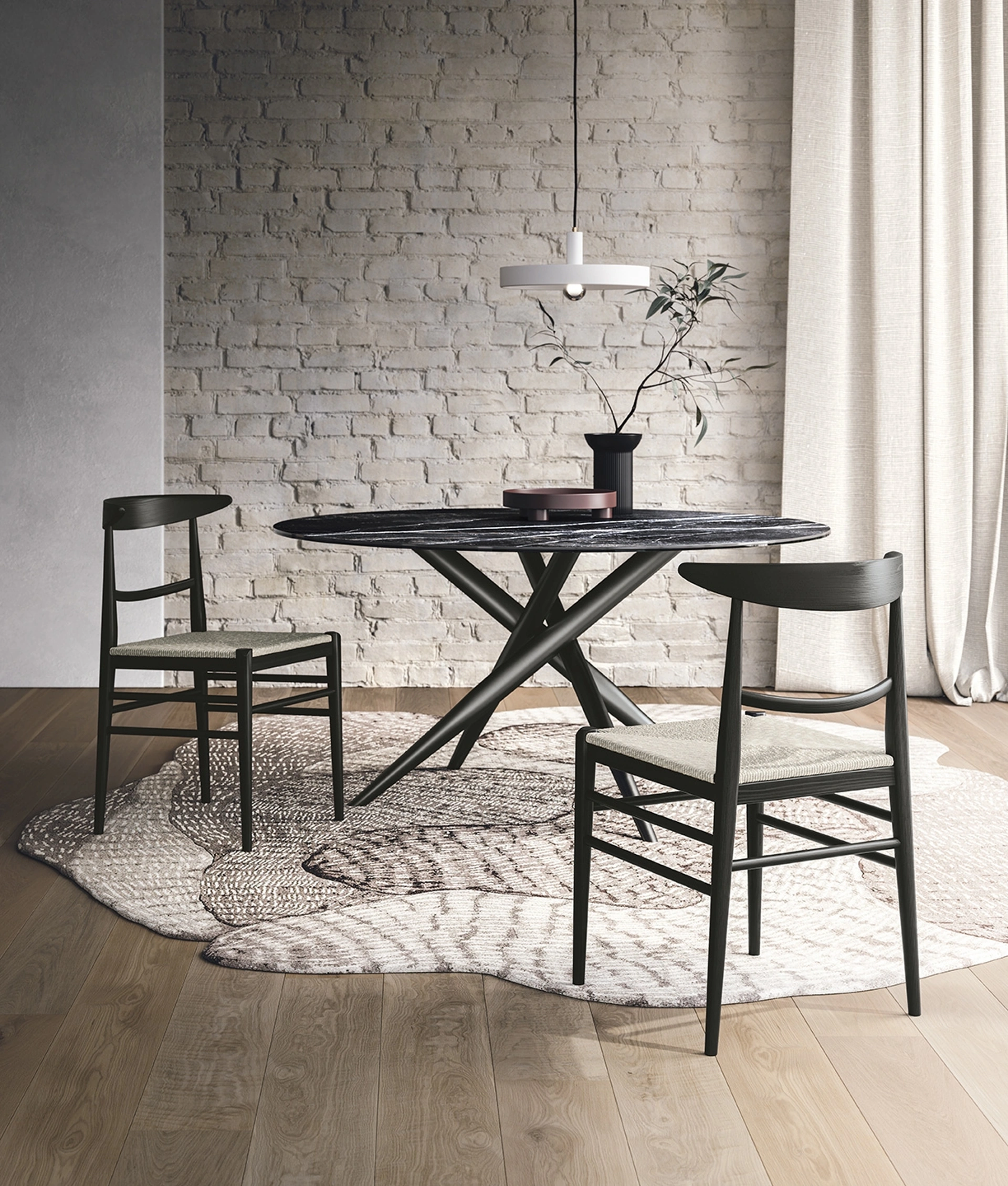 | Materiali: | Struttura Frassino Tinto Carbone, Sedile in Paglia o Rivestimento Cat. 1/One Nairobi 08 |