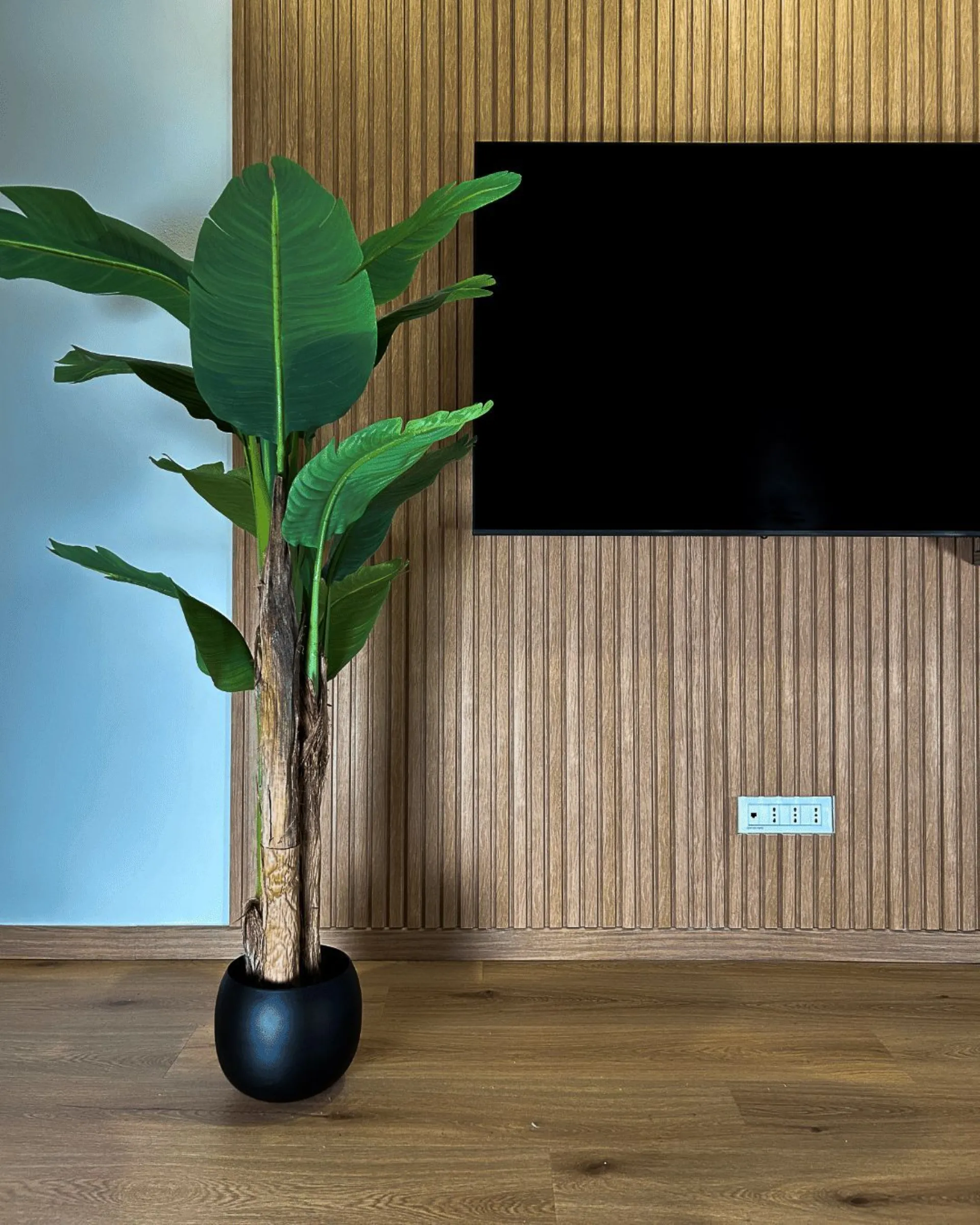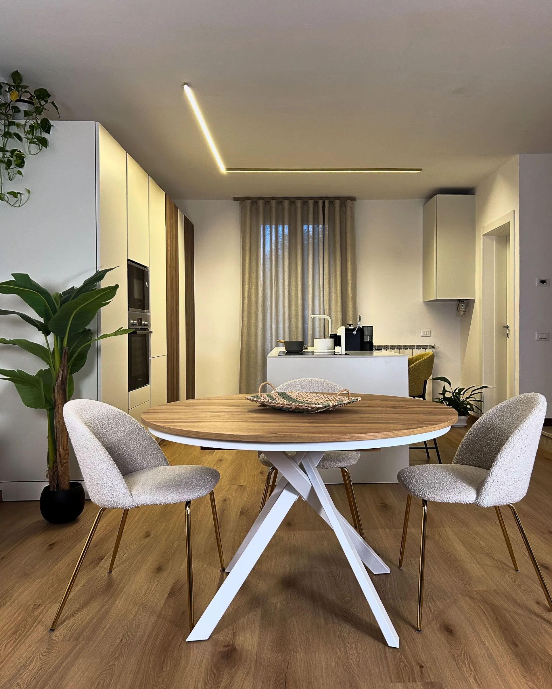 L'ambiente si apre poi verso la zona giorno, dove il bianco incontra nuovamente il richiamo naturale delle colonne. La zona TV è impreziosita da una boiserie a listelli verticali, un dettaglio di design moderno che conferisce ritmo e verticalità alla stanza, nascondendo con stile i cablaggi. A completare l'area dining, un tavolo da pranzo rotondo rompe la linearità delle forme, favorendo il flusso di movimento e la conversazione, creando un equilibrio perfetto tra estetica minimalista e accoglienza domestica.
