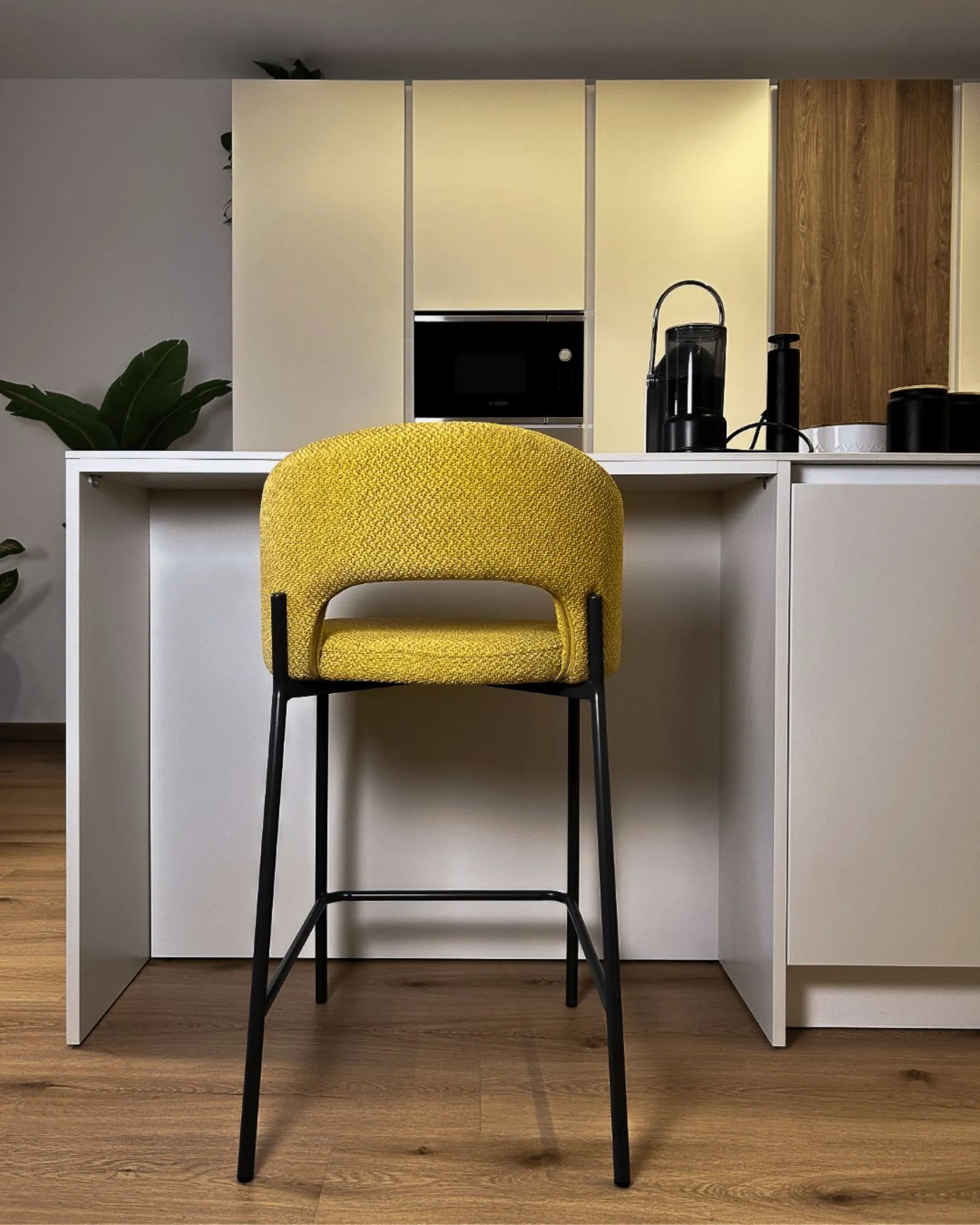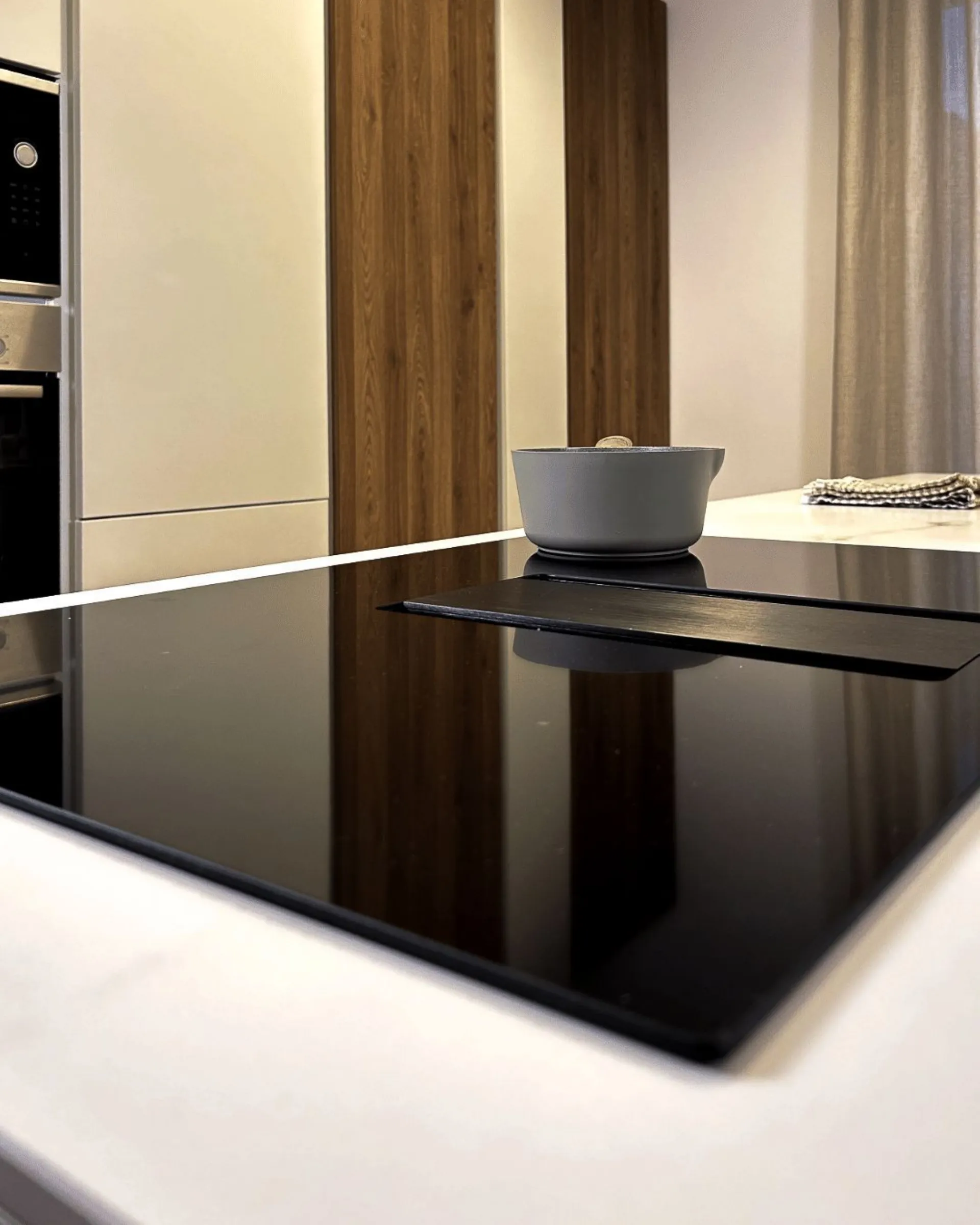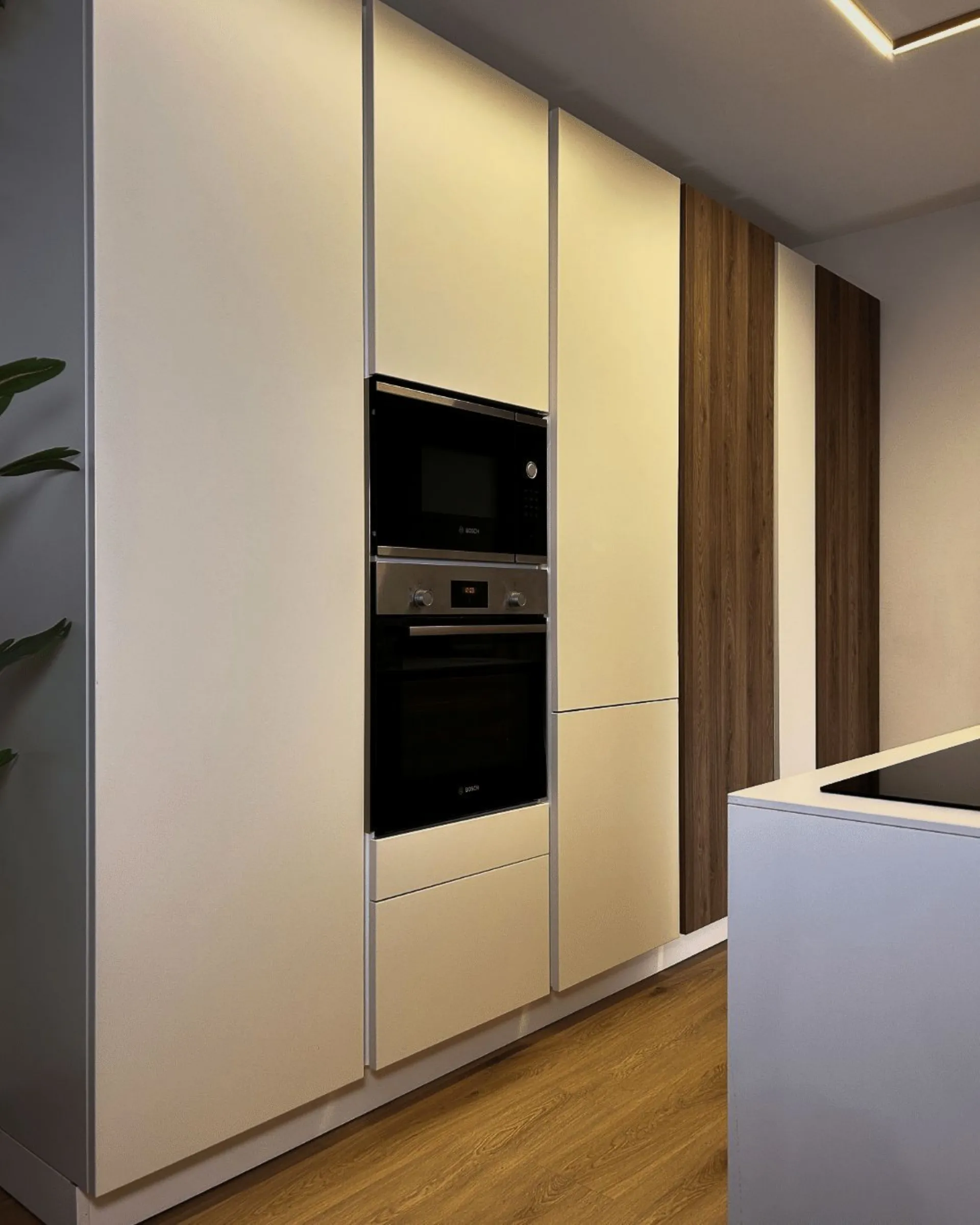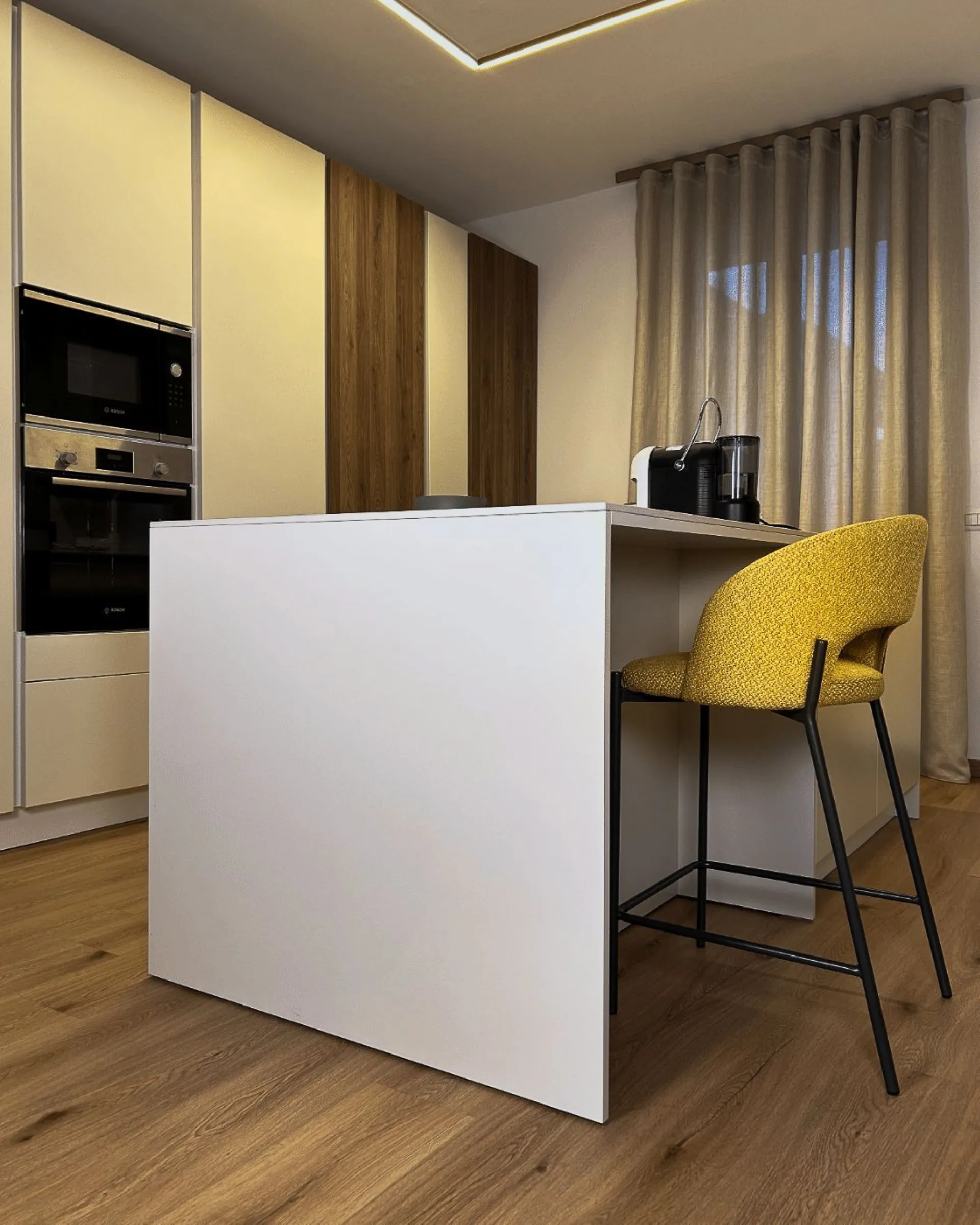 In questo progetto, la cucina e la zona living dialogano attraverso un linguaggio di estrema pulizia formale e materiali caldi. La cucina si sviluppa su una parete di colonne dove il rigore del total white viene interrotto con calore da due elementi in legno, creando un gioco di volumi alternati che dona ritmo e profondità alla composizione. Protagonista dello spazio è l'isola centrale, un blocco scultoreo che ospita il piano cottura a induzione con cappa integrata, eliminando ingombri visivi sospesi e mantenendo libera la prospettiva. Il piano snack integrato trasforma l'isola nel fulcro della convivialità quotidiana, perfetto per colazioni o aperitivi informali.