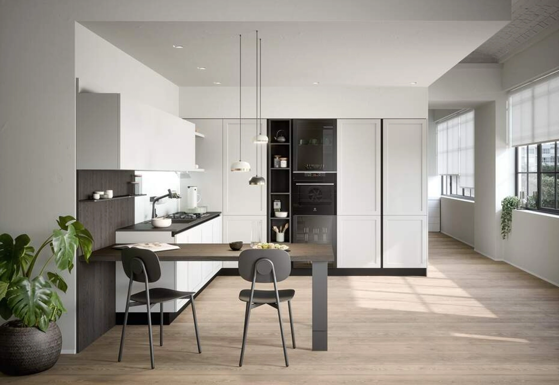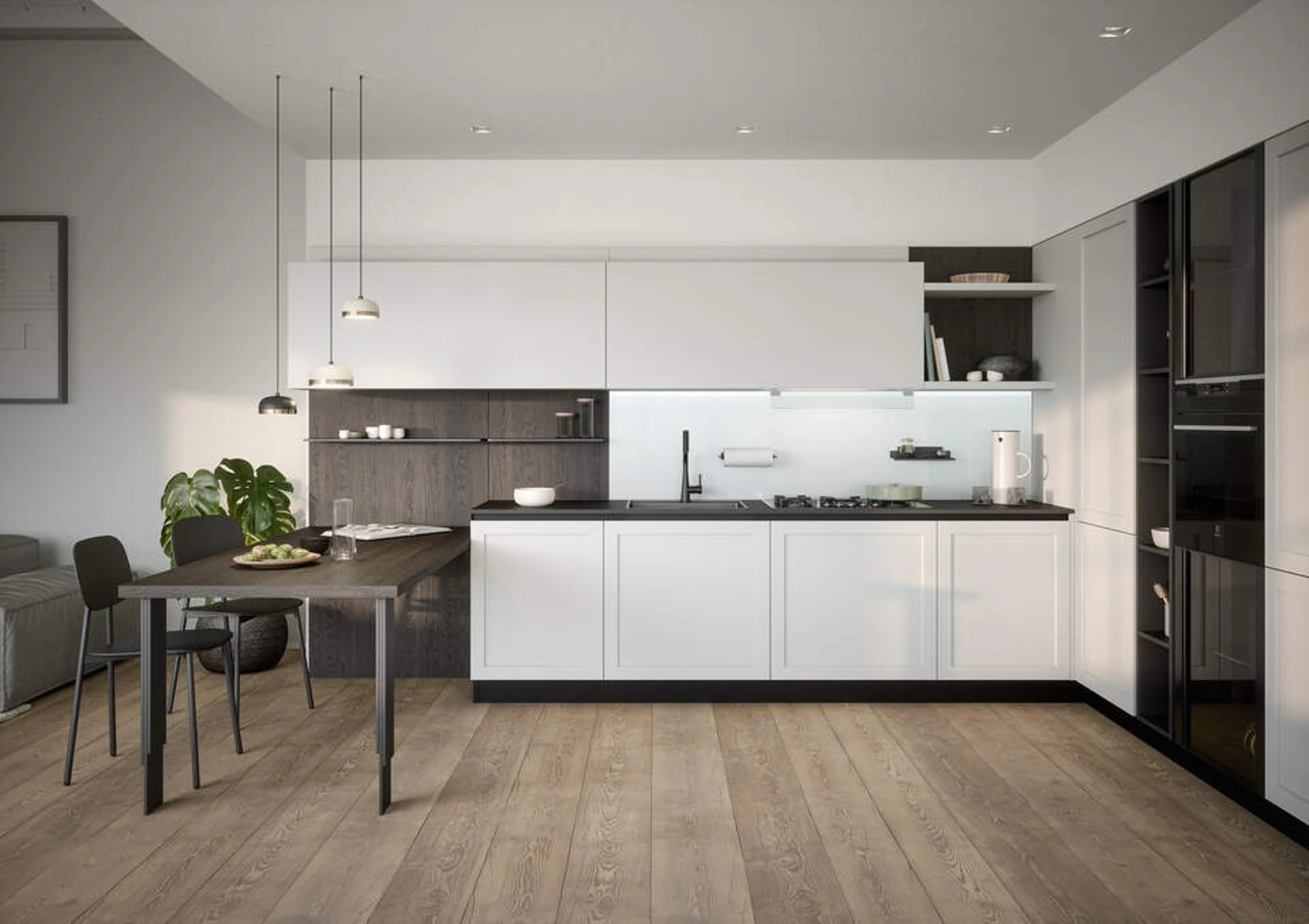 La cucina Clio Composizione 02 di Prima Cucine si distingue per la sua estetica contemporanea, caratterizzata da un elemento strutturale a telaio che fonde richiami vintage con un profilo essenziale e moderno. Questa composizione specifica è presentata in una combinazione cromatica di bianco e nero. La collezione Clio utilizza materiali all'avanguardia per robustezza come laminati di qualità e moderni PET, assicurando longevità e minima manutenzione. Il sistema di apertura personalizzabile con maniglia esterna o presa integrata nel profilo.