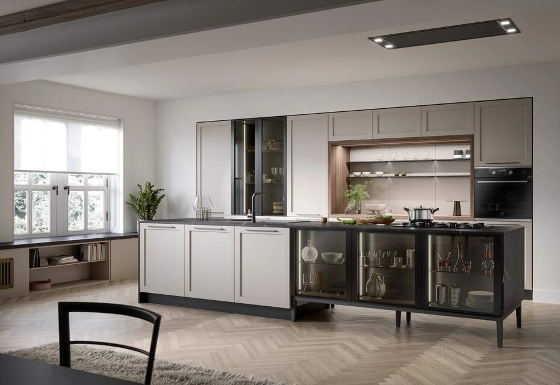 | Materiale: | PET (basi, pensili, colonne, schienali), HPL élite (top isola, fianchi), Laminato noce Canaletto (pannelli boiserie), HPL Fenix® nero Ingo (mensole), Vetro fumé grigio (vetrine), Alluminio (telaio vetrine) |