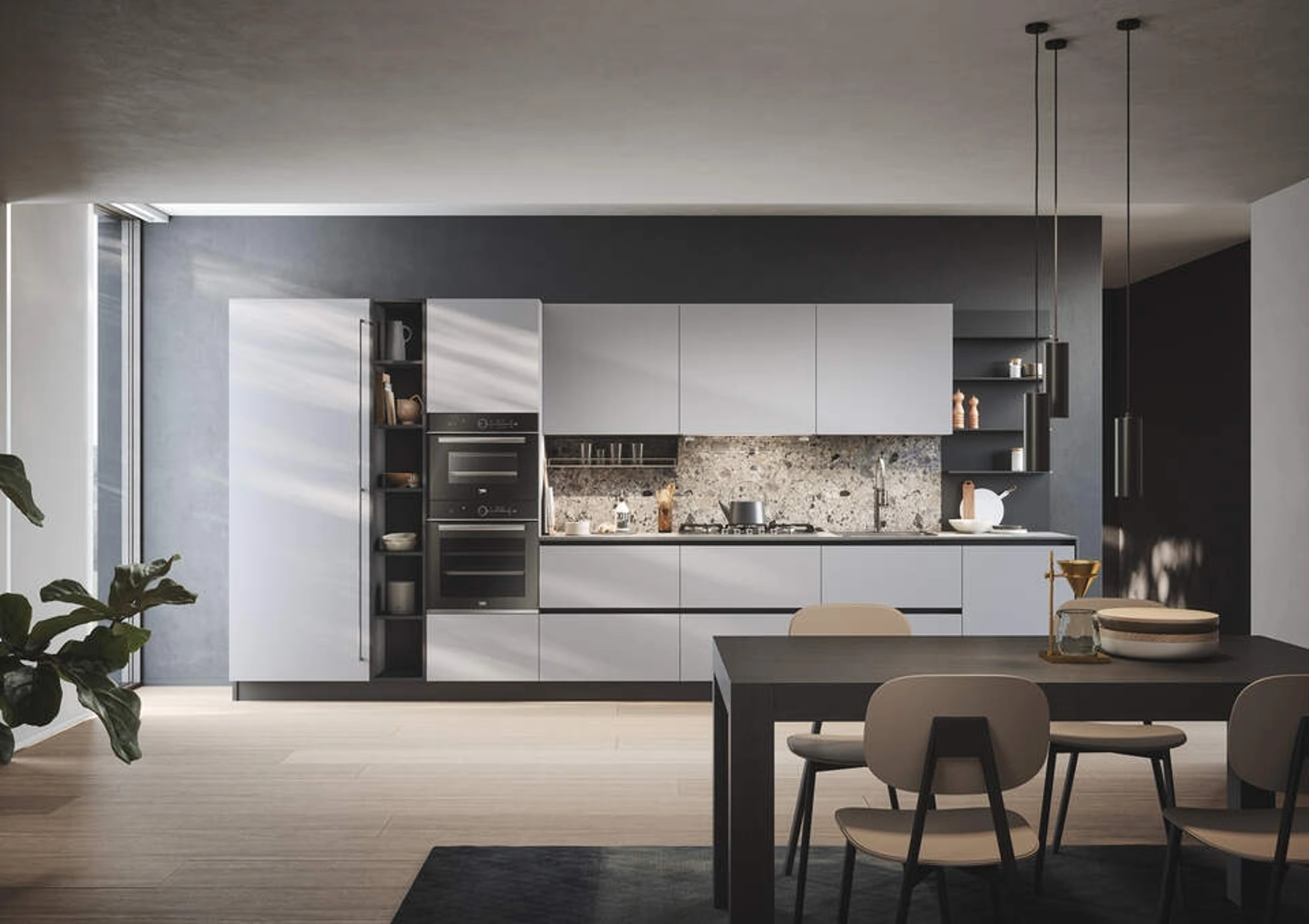 La Composizione 09 del modello Domino di Prima Cucine incarna un'interpretazione avanzata del design per cucine moderne. Caratterizzata da un'elevata versatilità, offre la possibilità di scegliere tra ante lisce o con finitura a cannette, garantendo un'integrazione estetica raffinata in ogni contesto abitativo. La struttura vanta ante con uno spessore di 22 mm, progettate per robustezza e durabilità, e può essere configurata con sistemi di apertura a gola o mediante l'applicazione di maniglie. Questa soluzione lineare, con dimensioni indicative di 330 cm in lunghezza e 265 cm in altezza, è ottimizzata per la massima personalizzazione grazie a un'ampia selezione di materiali e finiture, inclusi Melaminico, Laccato UV e PET, che ne definiscono la resistenza e l'impatto visivo. Ogni dettaglio costruttivo è calibrato per assicurare prestazioni funzionali eccellenti e una longevità superiore, riflettendo l'impegno del brand verso standard qualitativi elevati.