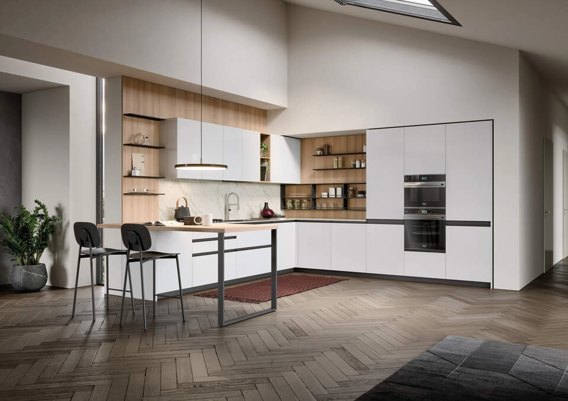 Tra i diversi modelli presenti nel catalogo Prima Cucine, la cucina nell'immagine rende lo spazio totalmente fruibile e danno la possibilità di vivere gli ambienti domestici appieno. Realizza con noi un progetto su misura: per vivere in pieno agio la tua abitazione, i nostri arredatori sono pronti a guidarti con serietà nell’acquisto. Se desideri comprare una soluzione in melaminico tra le diverse proposte ad angolo, massima componibilità della Cucina Moderna angolare con penisola Hera Composizione 03 di Prima Cucine ti darà modo di esprimere le tue esigenze d’arredo.