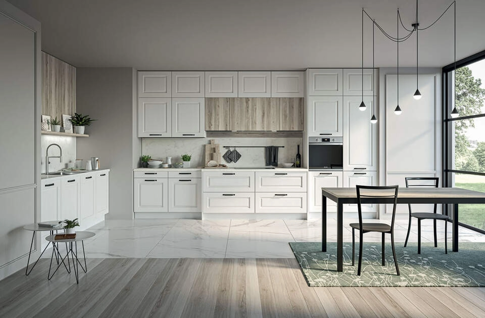 Scopri l'eleganza senza tempo della cucina Maya Composizione 01 di Prima Cucine, ora disponibile per la visione e l'acquisto presso il nostro showroom Trazzi Luciano & C. Snc a Poggio Rusco. Questo modello si distingue per il suo design classico e al contempo innovativo, con una configurazione a doppia parete che ottimizza lo spazio. Le ante a telaio, insieme ai piani di lavoro e agli schienali con una raffinata finitura striata bianca che evoca la pietra naturale, creano un ambiente accogliente e sofisticato. I pensili, con anta liscia in stile Domino, introducono un tocco di modernità, mentre le basi e le colonne sporgenti aggiungono profondità e dinamismo all'area dei fuochi. Un dettaglio funzionale e di design è la cappa elegantemente integrata nel pensile, garantendo linee pulite. L'illuminazione LED, con un profilo Cut incassato sotto la mensola del piano lavaggio, è regolabile per creare l'atmosfera perfetta. La nostra pluriennale esperienza è al servizio di chi arreda a Poggio Rusco e dintorni, offrendo non solo prodotti di qualità ma anche un supporto completo per la tua scelta.