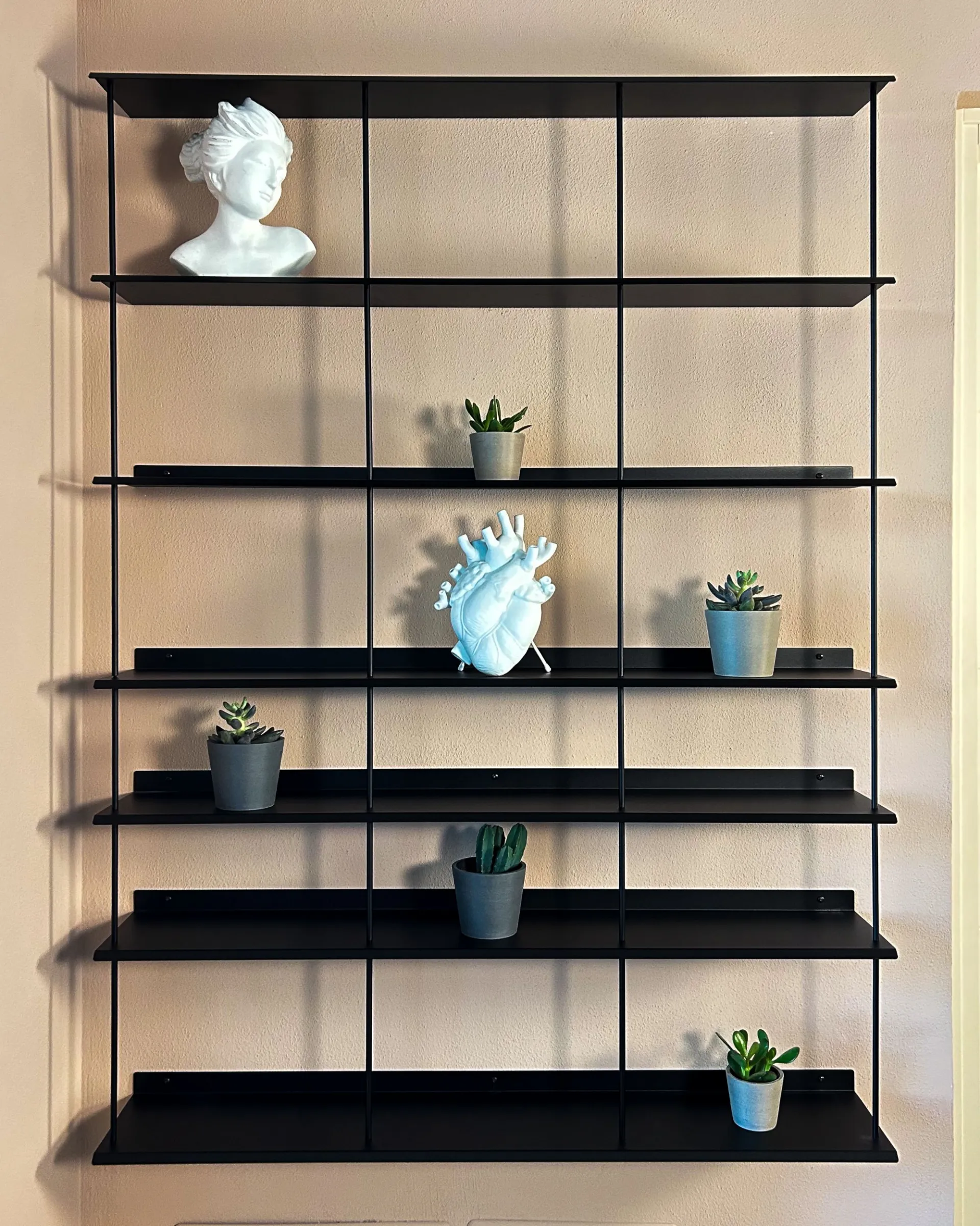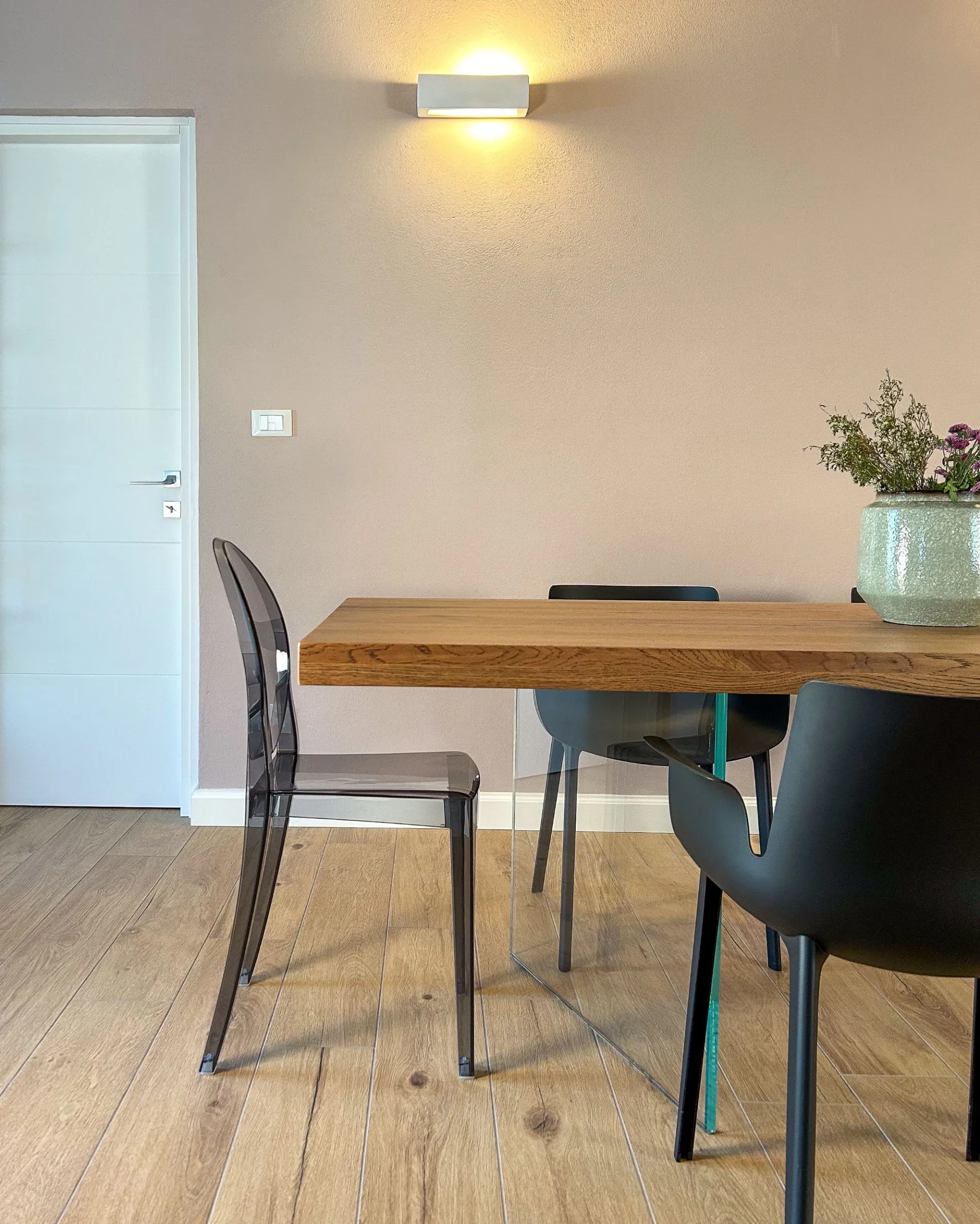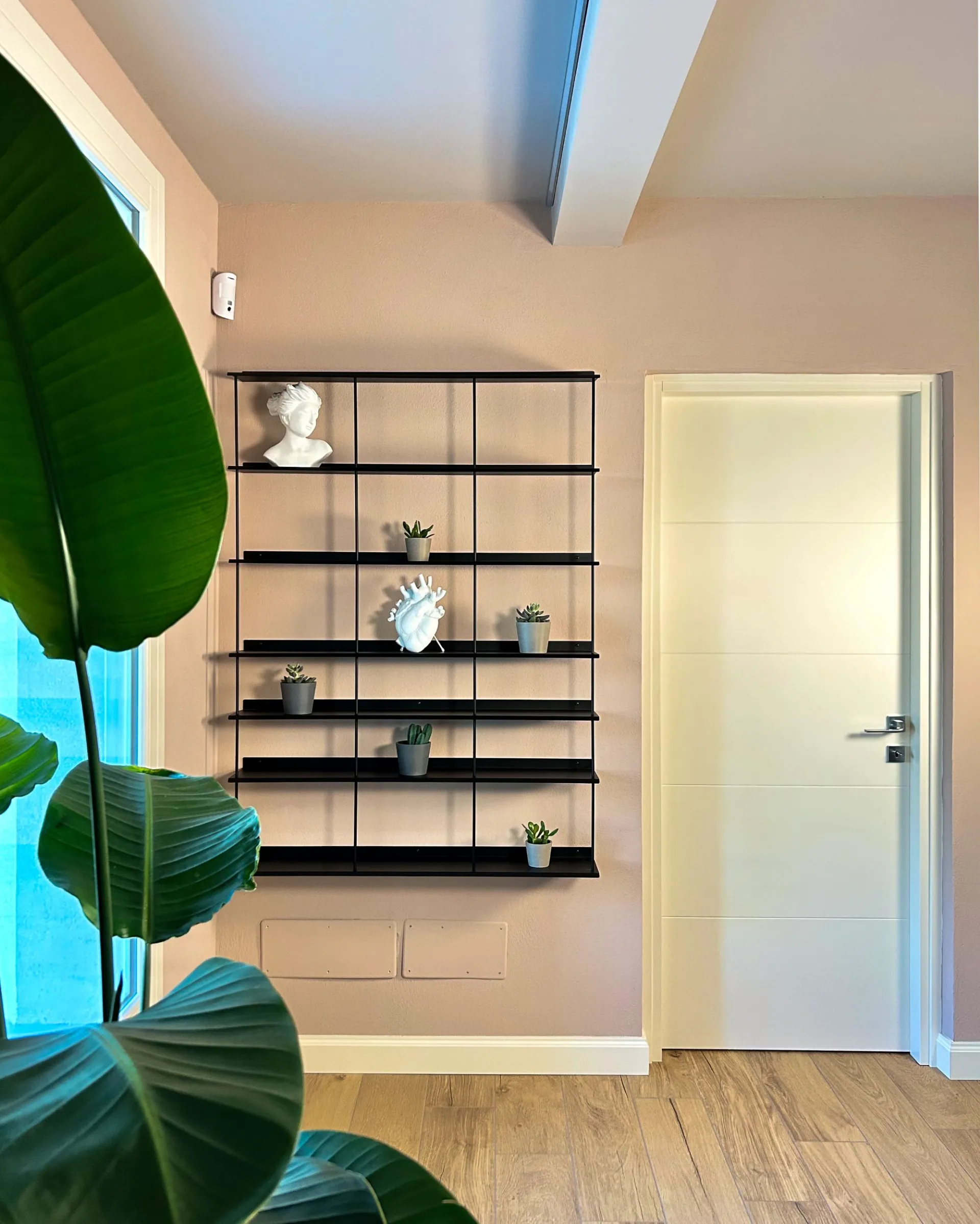 Il rosa cipria è un colore neutro caldo che smorza il rigore del grigio antracite e del metallo. La libreria sospesa senza schienale è stata scelta per la sua estrema leggerezza: i tratti sottili lasciano intravedere il colore della parete, trasformando un elemento contenitivo in una vera e propria decorazione minimalista.