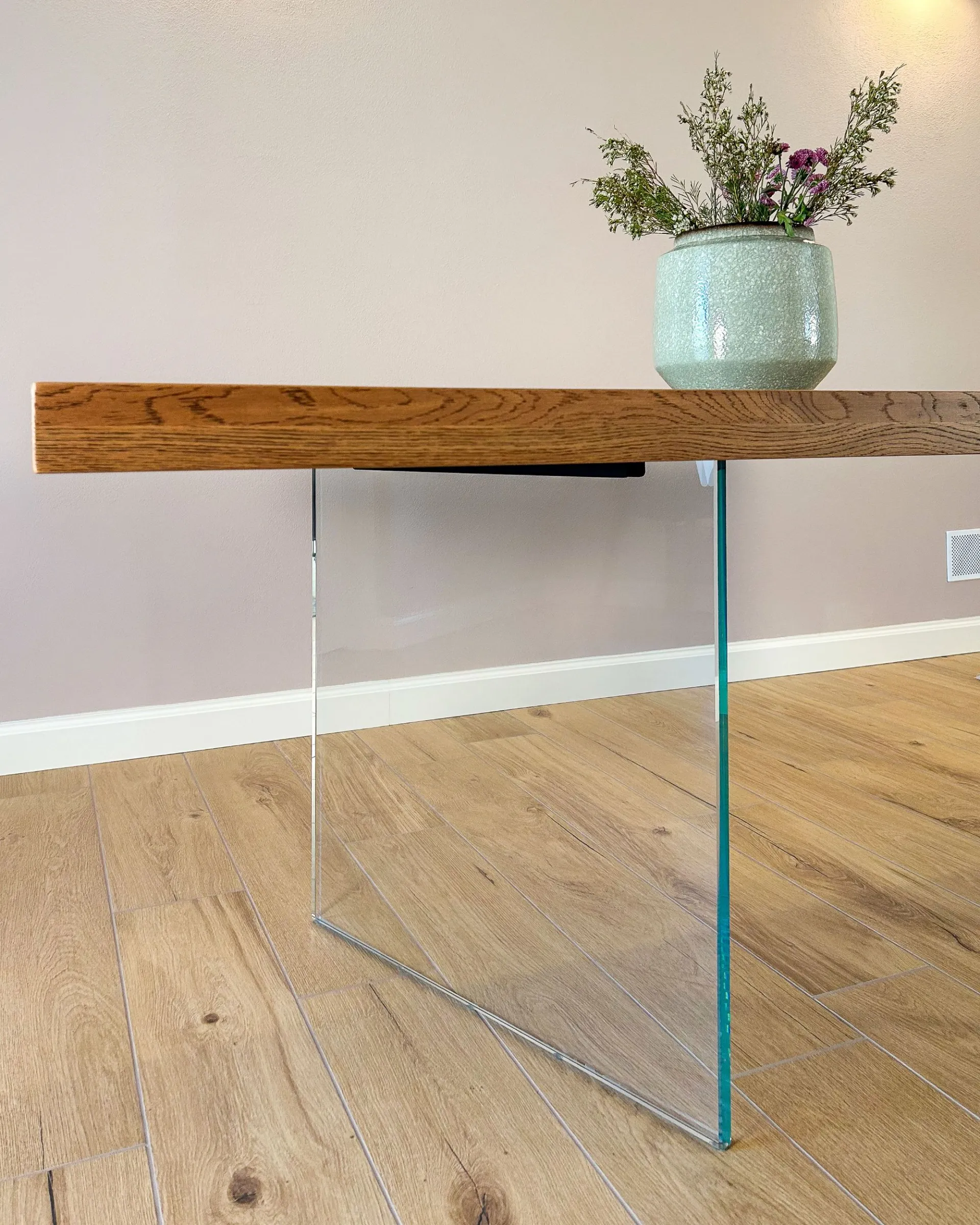 Assolutamente sì. Utilizziamo vetro temperato ad alto spessore, progettato per sostenere il peso del piano in legno e resistere agli urti. Esteticamente, le trasparenze delle gambe permettono alla luce di circolare liberamente, rendendo il tavolo "invisibile" e ideale per non sovraccaricare visivamente l'open space.