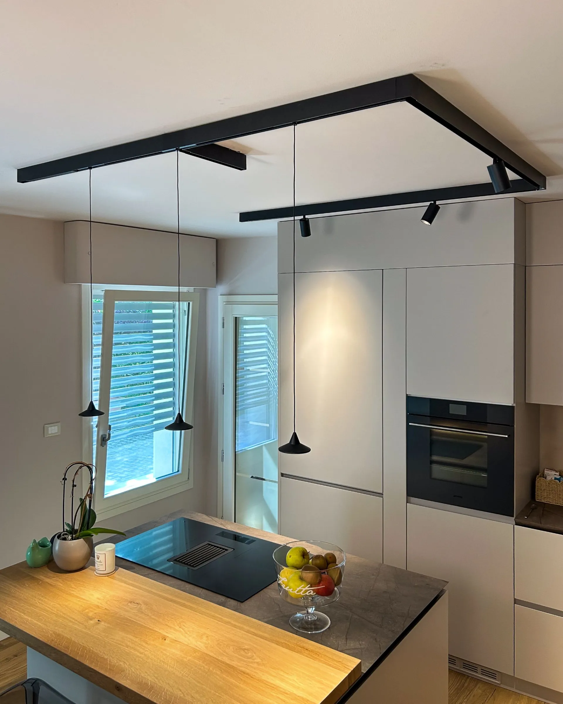 L'obiettivo è stato massimizzare l'ergonomia senza appesantire l'ambiente. Abbiamo scelto una configurazione con isola centrale e piano snack in legno, che funge sia da piano di lavoro che da zona colazione. Questa soluzione elimina la necessità di un tavolo ingombrante in cucina, lasciando respiro al passaggio verso il living.