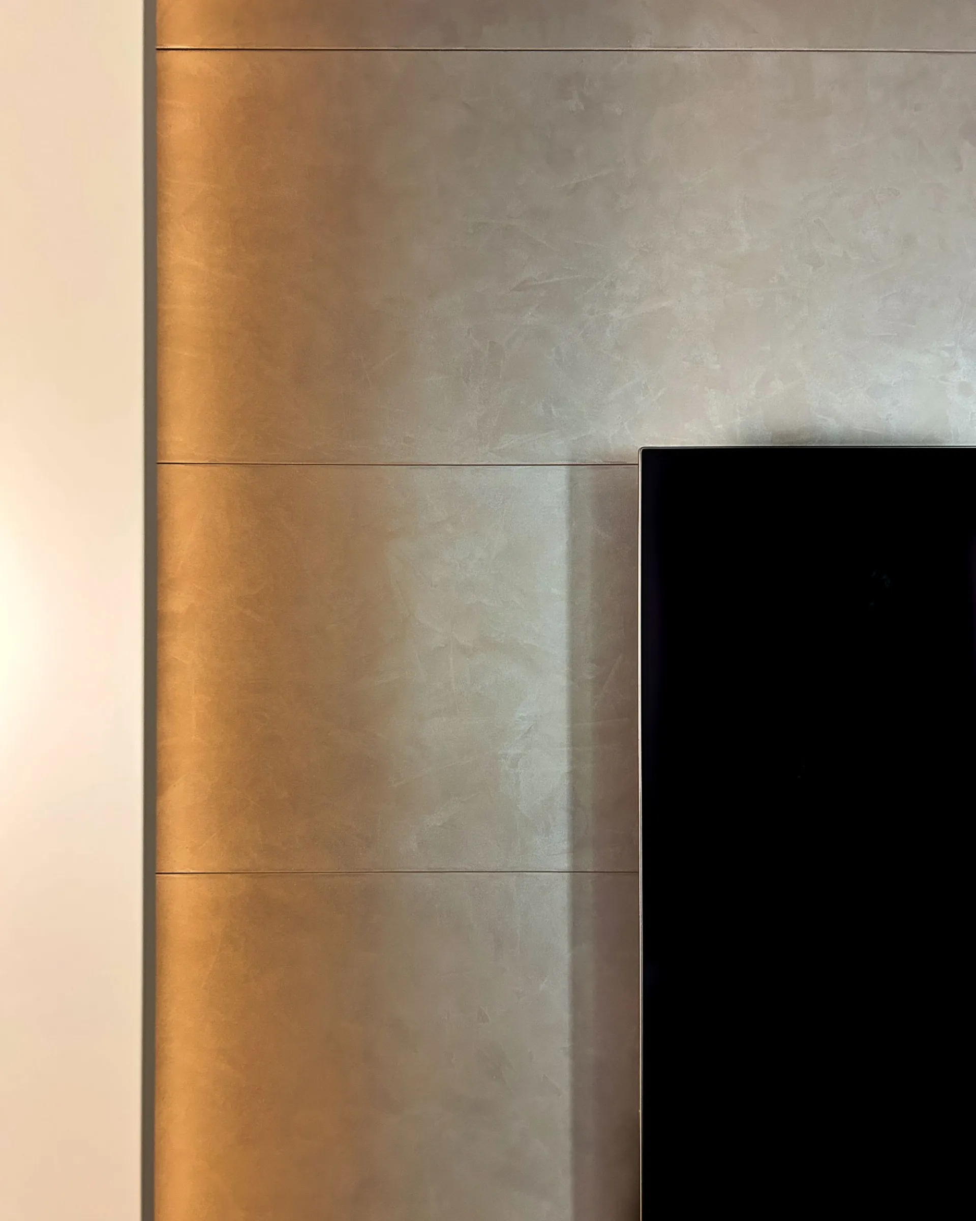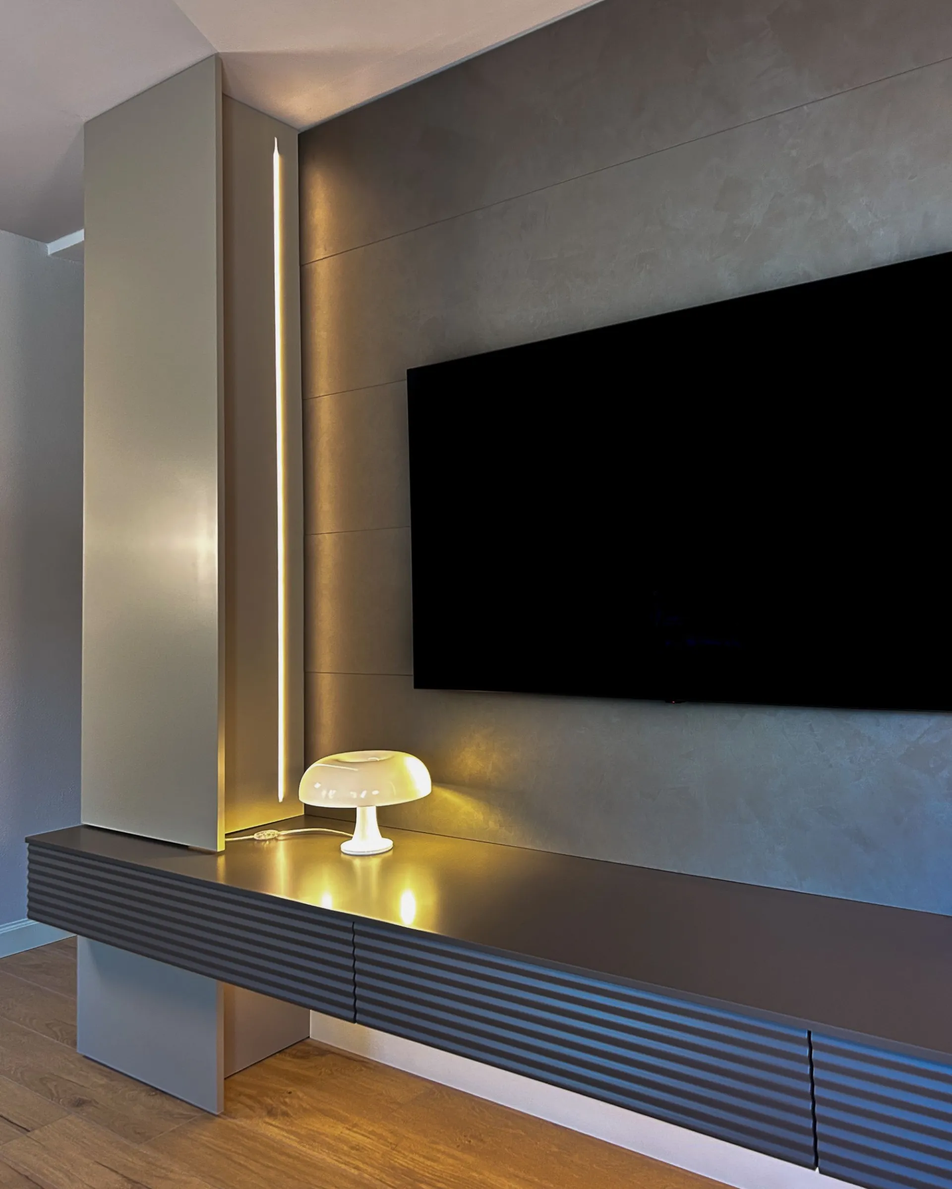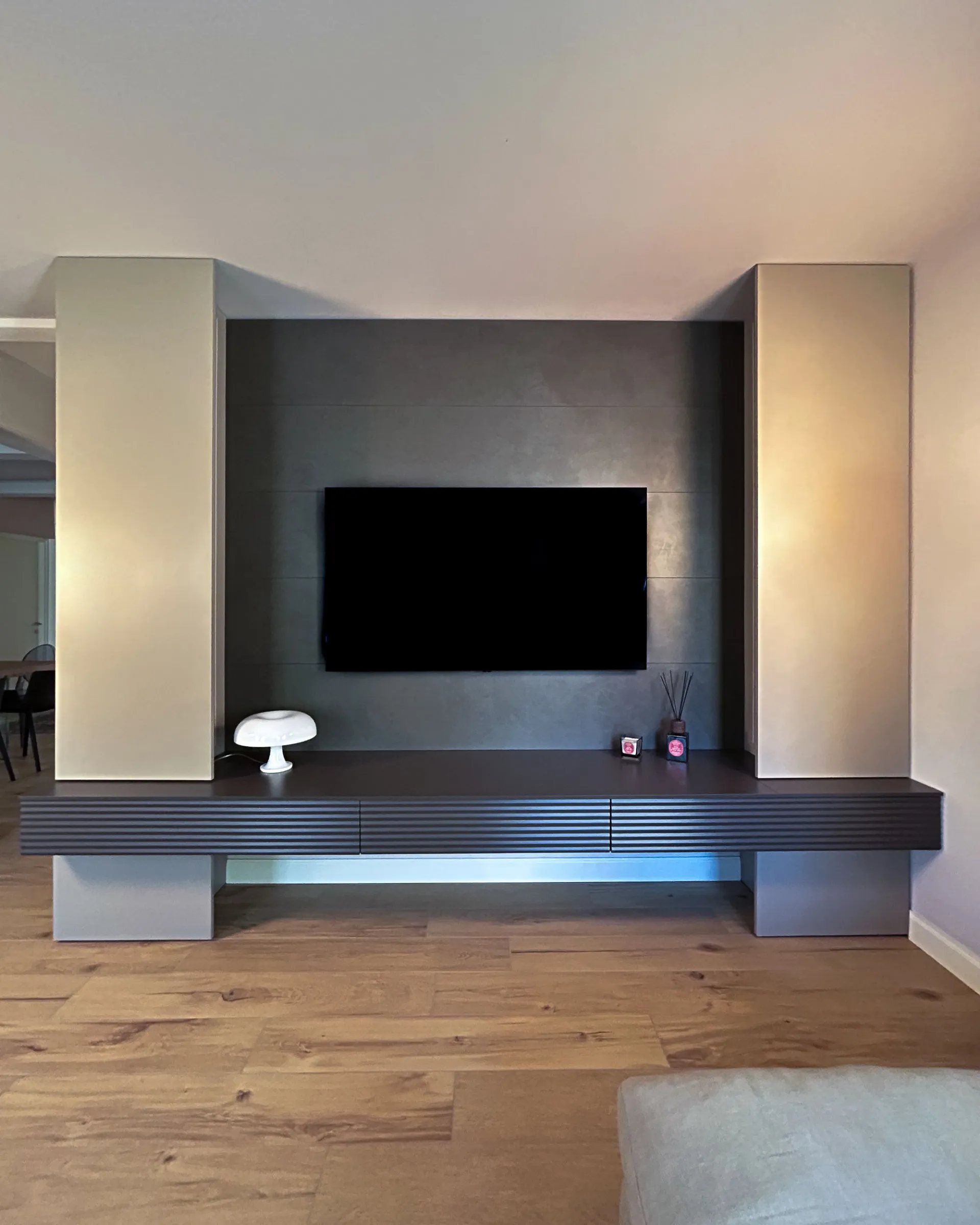 Abbiamo inserito delle strip LED ad alta resa cromatica incassate sui lati delle colonne a tutta altezza. Questa soluzione non ha solo uno scopo estetico (mettere in risalto la matericità della boiserie), ma offre anche una luce d'ambiente perfetta per la visione della TV, riducendo l'affaticamento visivo nelle ore serali.