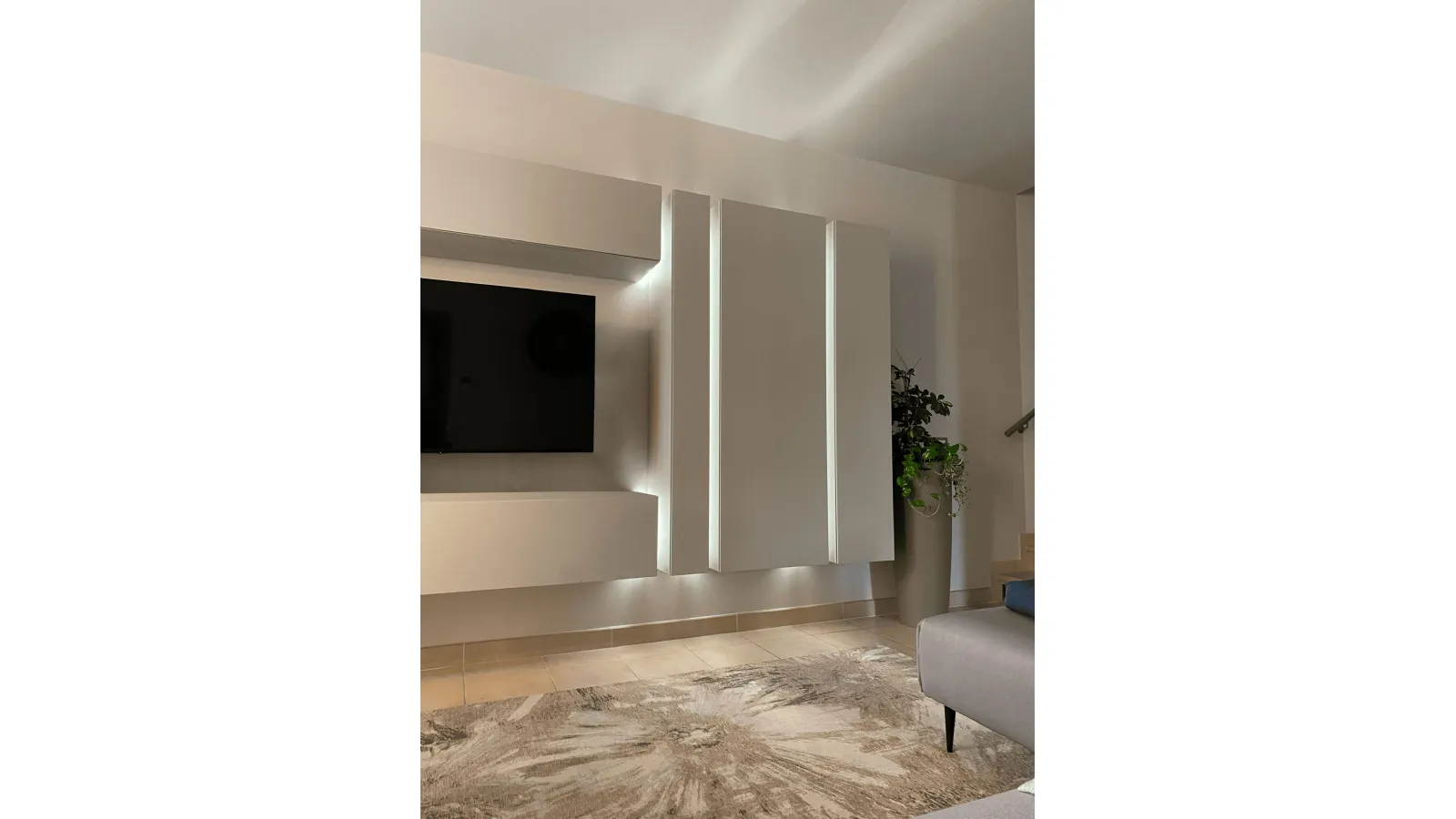progettata su misura per valorizzare l’area soggiorno e creare un ambiente elegante, funzionale e armonioso. La struttura, caratterizzata da linee pulite e minimaliste, integra perfettamente il televisore all’interno di un pannello centrale sospeso, studiato per garantire massima pulizia estetica e ordine visivo.