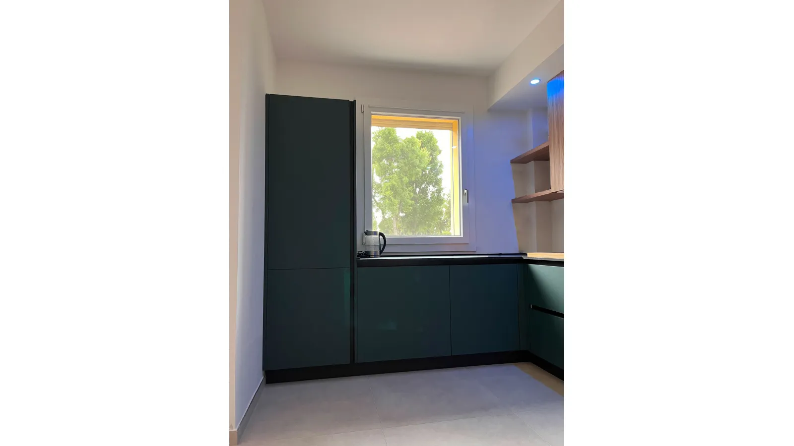 Scopri la nostra cucina angolare a Mirandola: un mix di verde, legno e dettagli neri per un design unico ed esclusivo. Arreda con stile!